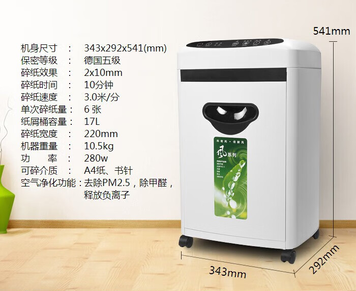 科密E106CA碎紙機(jī) 單位辦公用5級(jí)高保密小顆粒狀大容量空氣凈化文件粉碎機(jī)3米/分鐘17升280W 6張 10分鐘 2*6碎紙書釘 E106